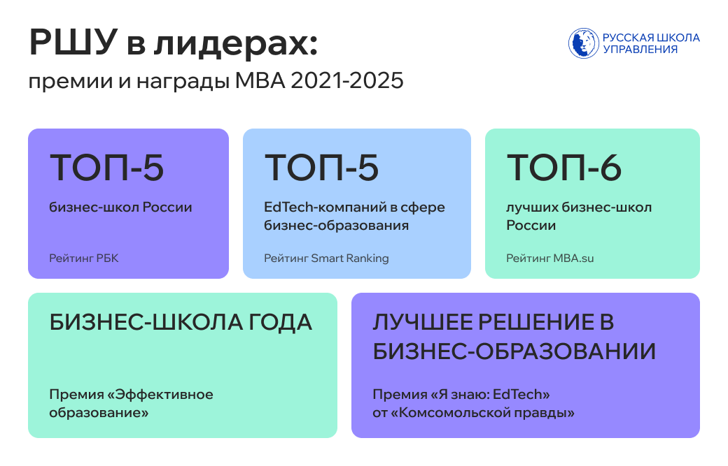 Со временем линейка MBA РШУ расширилась. Сейчас в каталог курсов также входят программы «MBA Эксперт», «MBA Лидер» и «Micro MBA». Кроме того, есть программы с отраслевыми специализациями, которые позволяют максимально полно разобрать ключевые управленческие инструменты в определенной сфере деятельности.